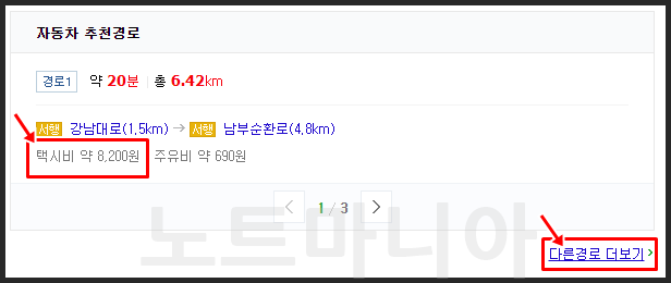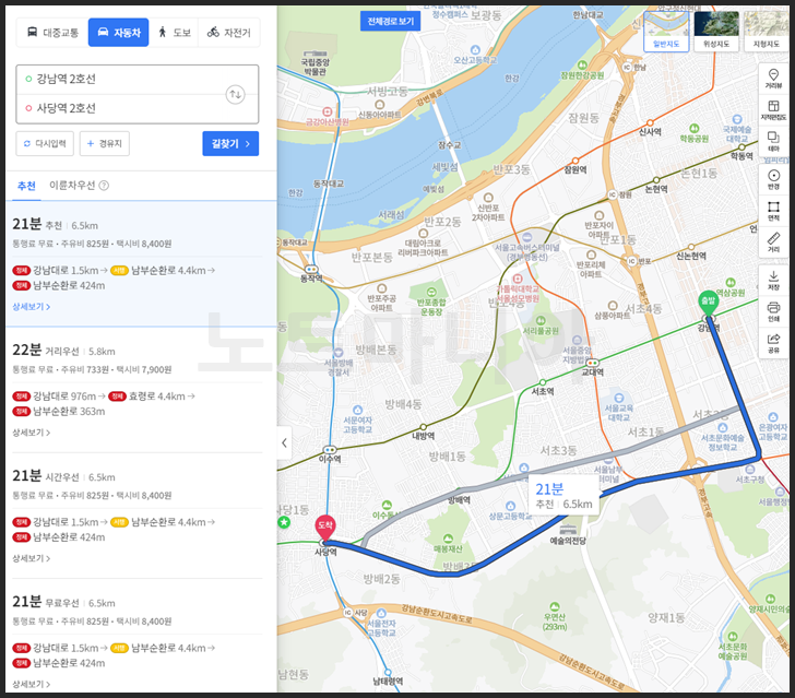 그러면 아래와같이 다른 경로도 조회가 가능하다. 지금은 시간 우선으로 결과가 나와서 결과적으로 조금 돌아가는 모습이 보인다. 그러므로 두번째 경로인 방배역을 거쳐서 가는 경로로 가달라고 말하면 약간의 요금을 절약할 수 있겠다. 택시비 계산기의 진면목이다.