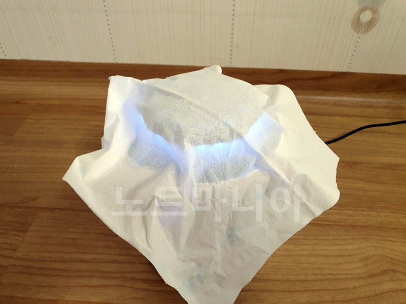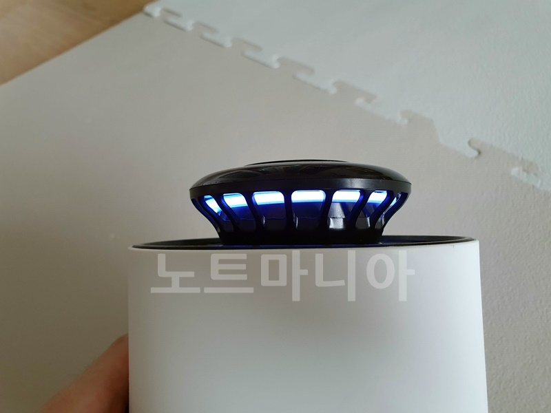 상단에 있는 버튼을 누르면 이렇게 근자외선 불빛이 희미하게 보인다. 그리고 안쪽에서 고효율 직류 팬이 동작하면서 바람소리가 난다. 옆에서 보면 이렇게 근자외선이 보이고 빛은 아래쪽으로 나간다는 사실을 알 수 있다.