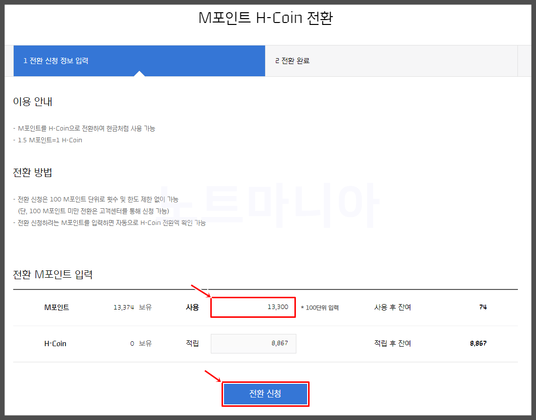 M포인트는 H-Coin으로 전환시, 1.5 : 1의 비율을 갖습니다. 그래서 저의 경우에는 13,374포인트가 있었는데, 100포인트 단위로 입력했더니, 8,867 H-Coin으로 적립되네요. 전환신청을 눌러줍니다.