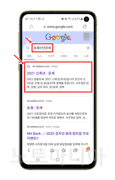 스마트폰으로 구글에서 '농협신년운세'라고 검색을 해주세요. 그러면 아래와같은 검색 결과나 나타납니다. 2022년 신축년 - 운세 라고 나온 첫번째 결과로 들어갑니다.