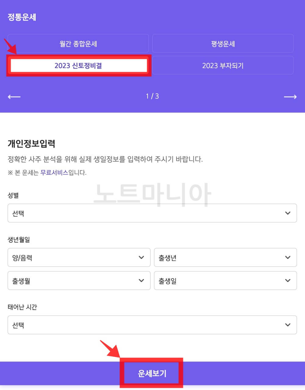 2. 아래와 같은 화면이 나오면 정통운세에서 2023 신토정비결을 선택하세요. 그리고 개인정보를 입력해줍니다. 성별, 생년월일, 태어난 시간을 입력해주세요. 그리고 '운세보기'를 눌러주세요.