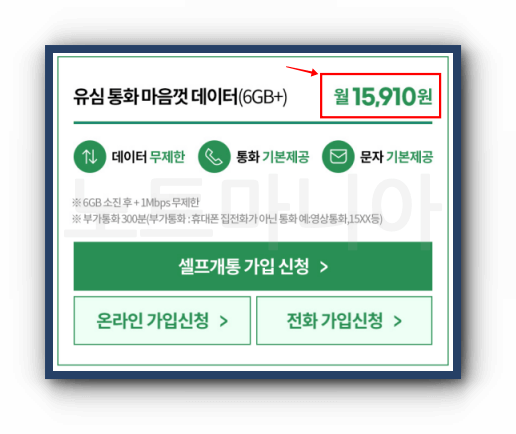 그래서 3Mbps로 무제한 데이터를 사용하면 훨씬 쾌적한데요. 그럴려면 유심 통화마음껏 데이터 15GB+를 사용하시는 것을 추천드립니다. 이 요금제는 한달에 25,300원입니다. 그래봤자 겨우 3만원도 안하네요. 다른조건은 똑같지만 처음 15GB를 모두 사용하면 3Mbps로 무제한 데이터 사용이 가능합니다.