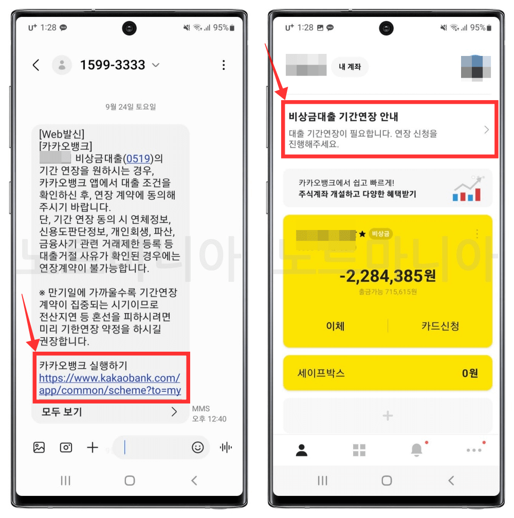 대부분의 경우, 저와 같이 문자로 대출연장신청을 안내 받았을텐데요. 간혹 수신거부를 해놓았거나 알림 거부 설정을 해놓으셨다면 만기에 도래하기 한달 전에 해당 알람을 받지 못했을수도 있습니다.