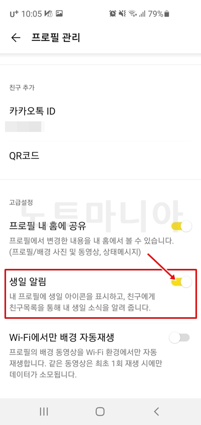 그러면 아래와 같은 화면이 나오는데, 아래쪽으로 내려오면 [생일 알림] 이 보인다. 이 항목을 꺼주면 내 생일이 카톡 친구들에게 나타나지 않는다.
