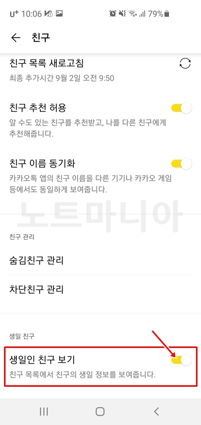 아래의 캡쳐 화면과 같이 나오면 아래쪽으로 내려와서 [생일인 친구 보기]를 OFF로 바꿔주면 카톡 친구 생일 보기가 꺼진다. 그러면 이렇게 친구 목록에 갔을 때, 아까 보이던 생일인 친구 홍목이 사라진다.